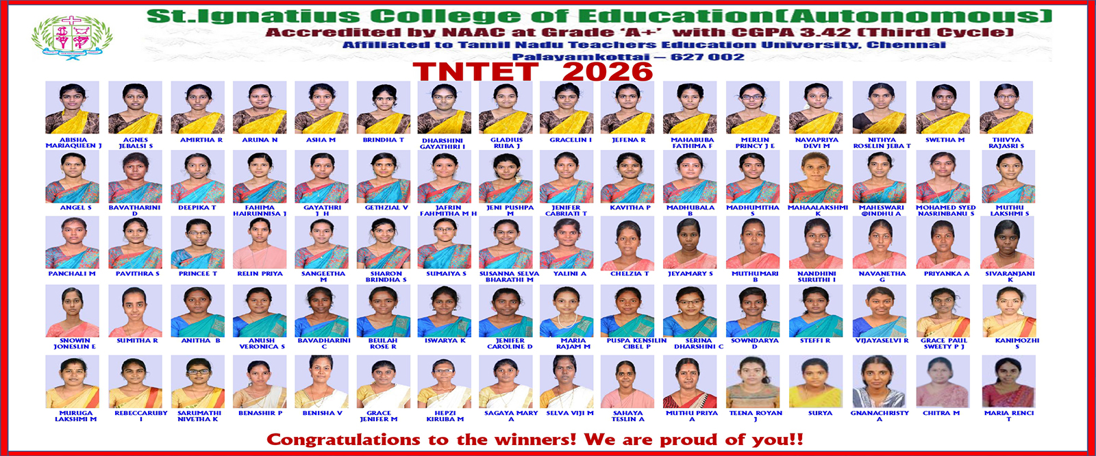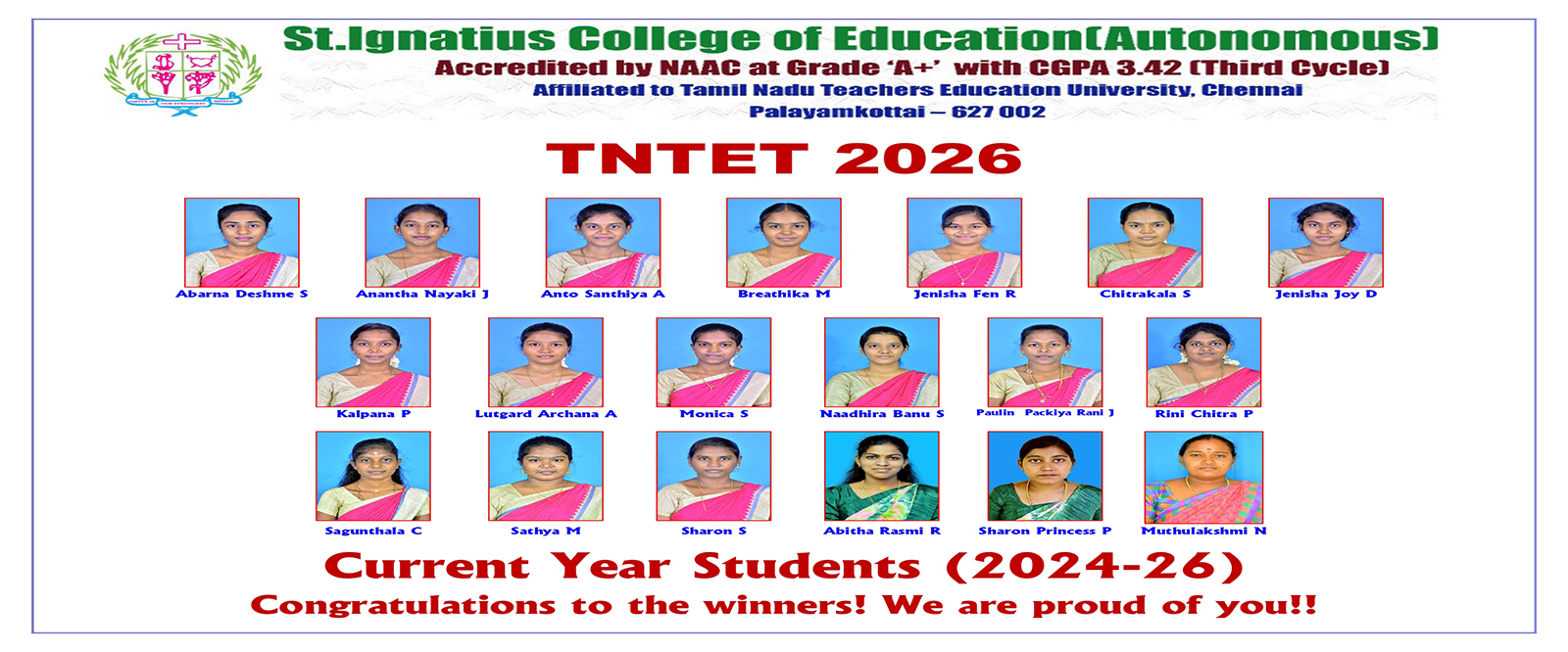 On behalf of everyone at St. Ignatius College of Education (Autonomous), Palayamkottai, we would like to welcome you to this site. As you peruse the site, you will gain insight into our college, our staff, our students and the various programmes we offer. We hope the website will inspire you to visit our college in person and participate in one of our weekly college tours where you will be able to see the vibrancy of our community.