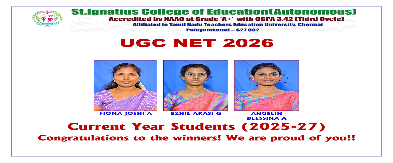 On behalf of everyone at St. Ignatius College of Education (Autonomous), Palayamkottai, we would like to welcome you to this site. As you peruse the site, you will gain insight into our college, our staff, our students and the various programmes we offer. We hope the website will inspire you to visit our college in person and participate in one of our weekly college tours where you will be able to see the vibrancy of our community.